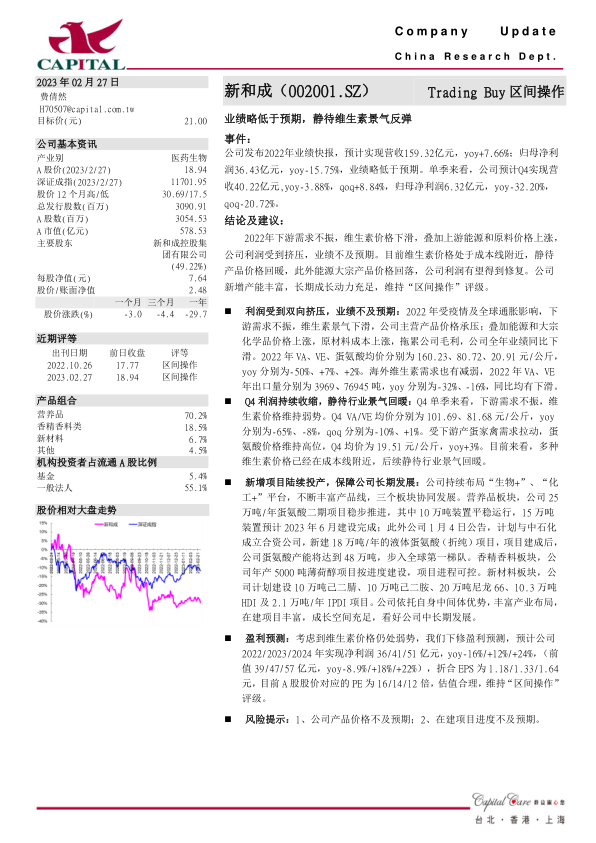 本报告分析了新和成(002001.SZ)2022年业绩快报,指出其业绩略低于预期,并维持“区间操作”评级。