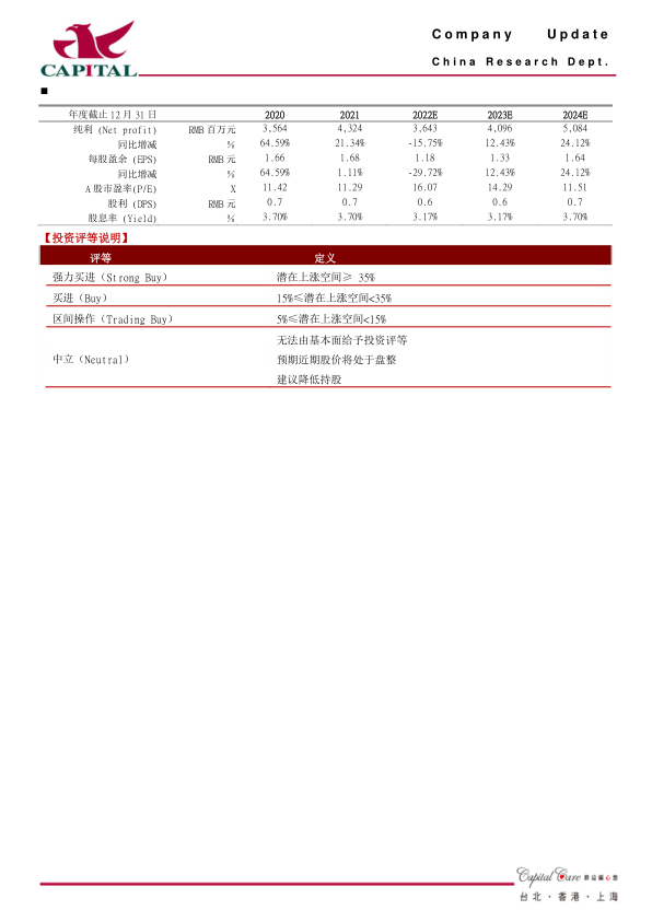 盈利预测:考虑到维生素价格仍处弱势,我们下修盈利预测,预计公司2022/2023/2024年实现净利润36/41/51亿元,yoy-16%/+12%/+24%,(前值39/47/57亿元,yoy-8.9%/+18%/+22%),折合EPS为1.18/1.33/1.64元,目前A股股价对应的PE为16/14/12倍,估值合理,维持“区间操作”评级。