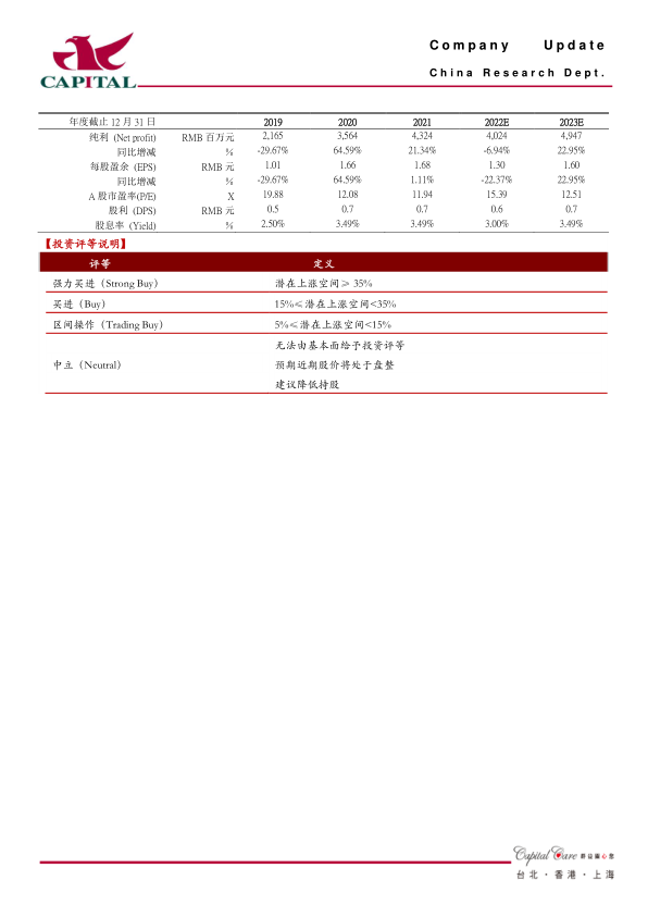 盈利预测:我们维持盈利预测不变,预计公司2022/2023年分别实现净利润40/49亿元,yoy-6.94%/+22.95%,折合EPS为1.30/1.60元,目前A股股价对应的PE为15/13倍,估值合理,维持“区间操作”评级。