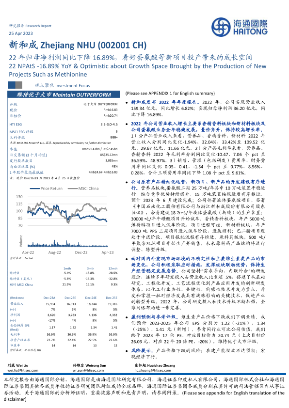 本报告分析了新和成(002001 CH)2022年的业绩表现,并展望了公司未来的发展前景。核心观点如下: