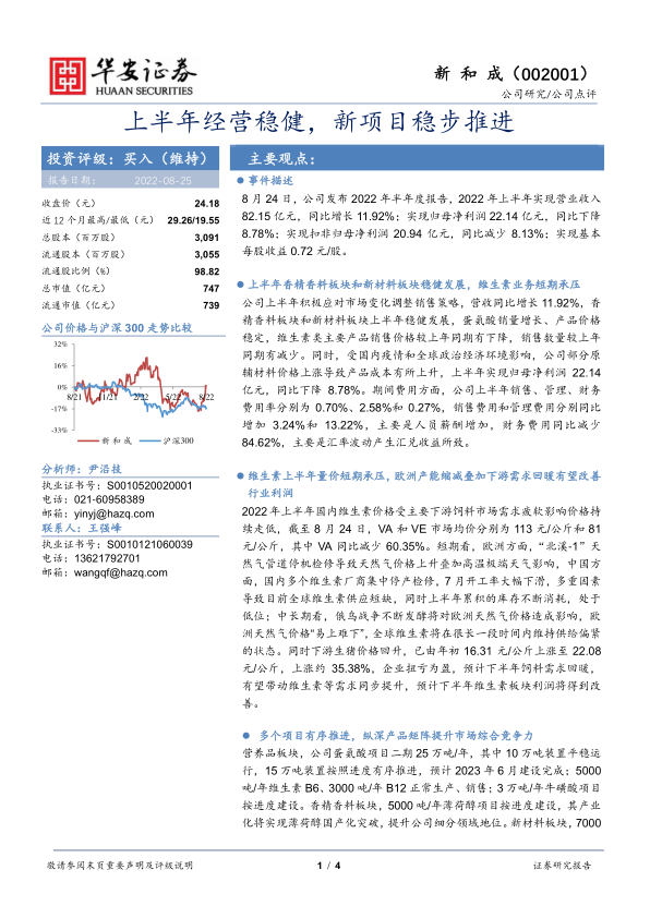 公司上半年积极应对市场变化调整销售策略,营收同比增长11.92%,香精香料板块和新材料板块上半年稳健发展,蛋氨酸销量增长、产品价格稳定,维生素类主要产品销售价格较上年同期有下降,销售数量较上年同期有减少。同时,受国内疫情和全球政治经济环境影响,公司部分原辅材料价格上涨导致产品成本有所上升,上半年实现归母净利润22.14亿元,同比下降8.78%。期间费用方面,公司上半年销售、管理、财务费用率分别为0.70%、2.58%和0.27%,销售费用和管理费用分别同比增加3.24%和13.22%,主要是人员薪酬增加,财务费用同比减少84.62%,主要是汇率波动产生汇兑收益所致。