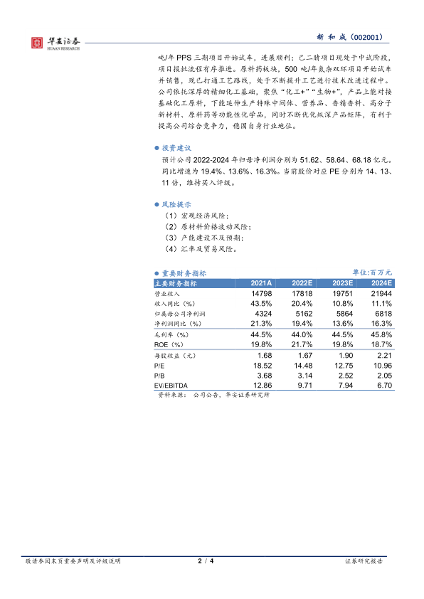 营养品板块,公司蛋氨酸项目二期25万吨/年,其中10万吨装置平稳运行,15万吨装置按照进度有序推进,预计2023年6月建设完成;5000吨/年维生素B6、3000吨/年B12正常生产、销售;3万吨/年牛磺酸项目按进度建设。香精香料板块,5000吨/年薄荷醇项目按进度建设,其产业化将实现薄荷醇国产化突破,提升公司细分领域地位。新材料板块,7000吨/年PPS三期项目开始试车,进展顺利;己二腈项目现处于中试阶段,项目报批流程有序推进。原料药板块,500吨/年氮杂双环项目开始试车并销售,现已打通工艺路线,处于不断提升工艺进行技术改进过程中。公司依托深厚的精细化工基础,聚焦“化工+”“生物+”,产品上能对接基础化工原料,下能延伸生产特殊中间体、营养品、香精香料、高分子新材料、原料药等功能性化学品,同时不断优化纵深产品矩阵,有利于提高公司综合竞争力,稳固自身行业地位。