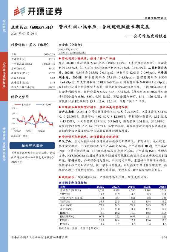 康缘药业2024年上半年营收和利润出现小幅下滑,但公司在研发创新和合规建设方面的努力值得肯定。报告维持对康缘药业“买入”评级,尽管下调了未来几年的盈利预测,但仍看好公司的长期发展。