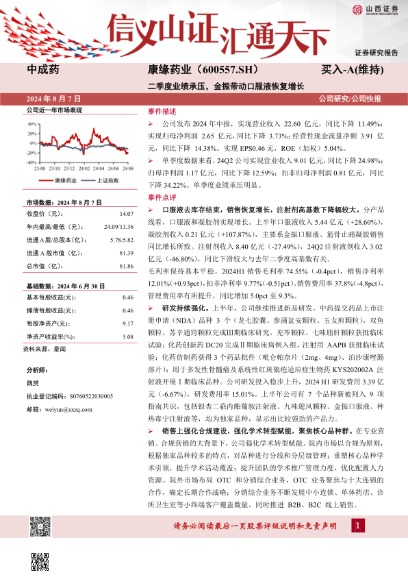 康缘药业2024年中期业绩虽受注射剂下滑影响,但口服液和凝胶剂的增长显示出公司在特定产品线的优势。