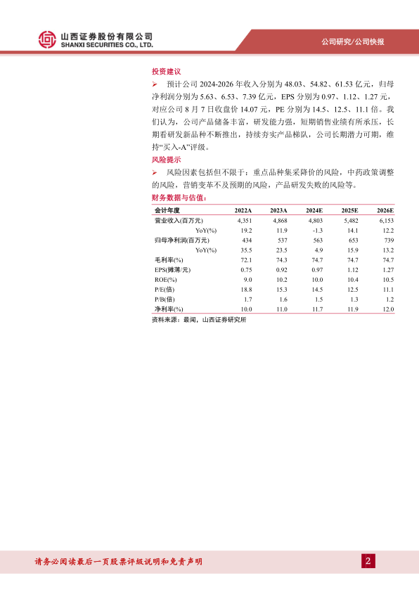 风险因素包括但不限于:重点品种集采降价的风险,中药政策调整的风险,营销变革不及预期的风险,产品研发失败的风险等。