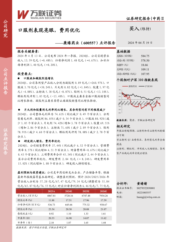 康缘药业在2024年第一季度展现出稳健的经营态势,归母净利润实现增长,主要得益于口服液和凝胶剂等非注射剂产品的强劲表现。公司在优化费用结构的同时,持续加大研发投入,体现了其作为中药创新龙头企业的战略定力。分析师上调了未来三年的营收预测,并维持“买入”评级,肯定了公司的长期增长潜力。投资者需关注政策变化、产品质量及研发进展等潜在风险。