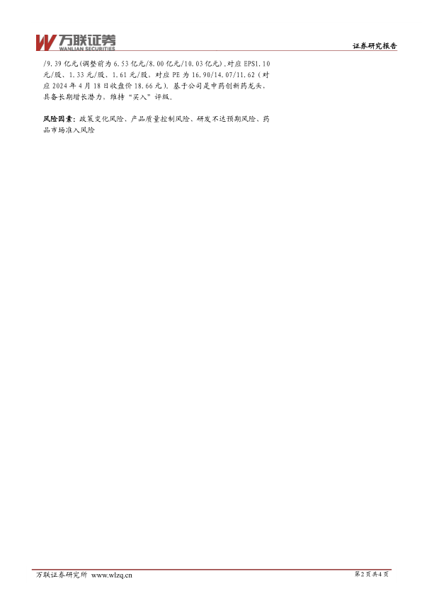 盈利预测与投资建议:公司是中药创新龙头企业,产品储备丰厚,根据最新年报披露等基本面研究,调整盈利预测,预计2024/2025/2026年营业收入分别为57.20亿元/67.47亿元/79.34亿元(调整前为55.84亿元/65.07亿元/76.55亿元);对应归母净利润为6.46亿元/7.75亿元/89.39亿元(调整前为6.53亿元/8.00亿元/10.03亿元)。对应EPS1.10元/股、1.33元/股、1.61元/股,对应PE为16.90/14.07/11.62(对应2024年4月18日收盘价18.66元)。基于公司是中药创新药龙头,具备长期增长潜力,维持“买入”评级。