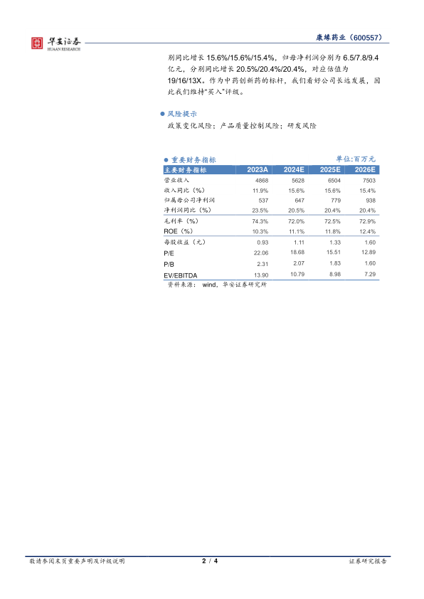 我们预计公司2024~2026年收入分别为56.3/65.0/75.0亿元,分别同比增长15.6%/15.6%/15.4%,归母净利润分别为6.5/7.8/9.4亿元,分别同比增长20.5%/20.4%/20.4%,对应估值为19/16/13X。作为中药创新药的标杆,我们看好公司长远发展,因此我们维持“买入”评级。
