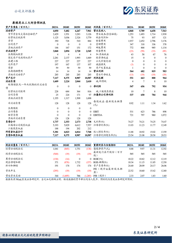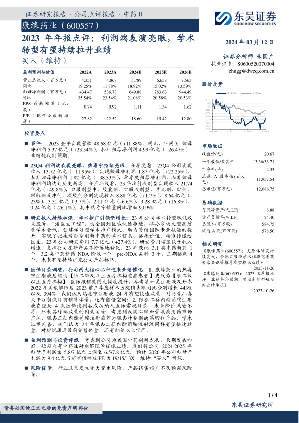 基于公司作为中药创新龙头的长期发展潜力以及中药注射剂解限等短期业绩提振因素,东吴证券上调了康缘药业2024-2025年归母净利润预测,分别由5.8亿元/7亿元上调至6.5亿元/7.8亿元,并预计2026年公司归母净利润为9.4亿元。当前市值对应2024-2026年PE分别为19/15/13倍,维持“买入”评级。