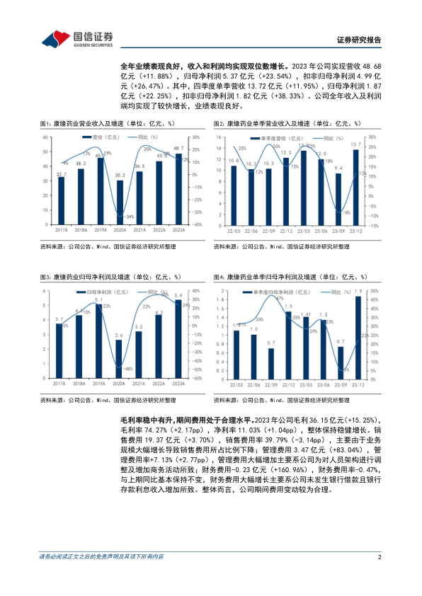 康缘药业2023年全年业绩表现强劲,营收和归母净利润均实现双位数增长,分别达到48.68亿元(+11.88%)和5.37亿元(+23.54%)。公司毛利率稳中有升至74.27%,净利率提升至11.03%,显示出良好的盈利能力。注射剂业务,特别是热毒宁注射液,贡献了显著增长,同比增长49.80%至21.74亿元。公司持续加大研发投入,研发费用同比增长27.40%至7.72亿元,研发费用率提升至15.85%,并在中药、化学药和生物药领域取得了多项新药注册、临床批件及一致性评价成果,为未来增长奠定基础。