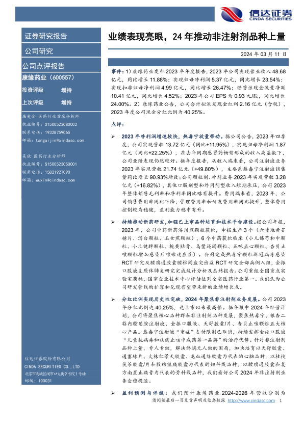 事件:1)康缘药业发布2023年年度报告,2023年公司实现营业收入48.68亿元,同比增长11.88%;实现归母净利润5.37亿元,同比增长23.54%;实现扣非归母净利润4.99亿元,同比增长26.47%;经营性现金流量净额10.41亿元,同比增长4.52%;2023年公司EPS为0.93元/股,同比增长24.00%。2)康缘药业公告,公司合计拟派发现金红利2.16亿元(含税),2023年度公司现金分红比例为40.25%。