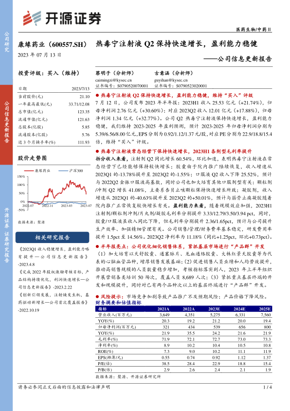 7 月 12 日,公司发布 2023 年半年报: 2023H1 收入 25.53 亿元(+21.74%),归母净利润 2.76 亿元(+30.60%);对应 2023Q2 收入 12.01 亿元(+17.88%),归母净利润 1.34 亿元(+32.77%)。公司 Q2 热毒宁注射液保持快速增长,盈利能力稳健, 我们维持 2023-2025 年盈利预测,预计 2023-2025 年归母净利润分别为5.39/6.56/8.00亿元, EPS分别为0.92/1.12/1.37元/股, 对应PE分别为22.9/18.8/15.4倍,维持“买入”评级。