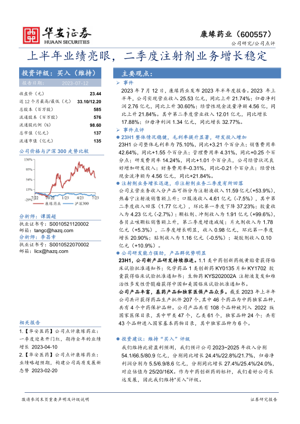 康缘药业2023年上半年业绩表现出色,主要得益于注射剂业务的强劲增长和公司整体盈利能力的提升。公司持续加大研发投入,创新药研发取得显著进展,产品群优势明显。维持“买入”评级,看好公司未来发展。