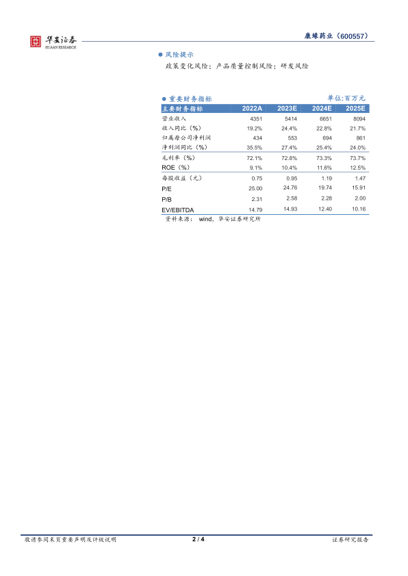 维持此前盈利预测,预计公司2023~2025年收入分别 54.1/66.5/80.9亿元,分别同比增长24.4%/22.8%/21.7%,归母净利润分别为5.5/6.9/8.6亿元,分别同比增长27.4%/25.4%/24.0%,对应估值为25/20/16X。作为中药创新药的标杆,看好公司长远发展,因此维持“买入”评级。