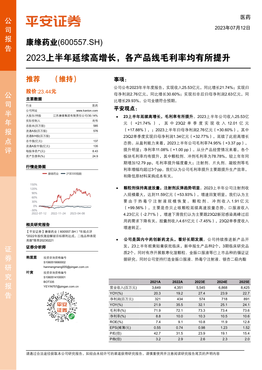 康缘药业2023年上半年业绩表现亮眼,延续了高增长态势,盈利能力显著提升。公司在产品结构优化和新产品研发方面持续发力,长期发展潜力值得期待。平安证券维持对公司“推荐”评级,但同时也提示了新药研发、市场准入和降价等风险。投资者应关注相关风险因素,谨慎决策。