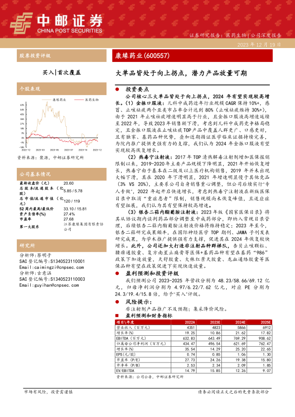 公司核心三大单品皆处于向上拐点, 2024 年有望实现较高增长。(1)金振口服液: 儿科中成药近年行业规模 CAGR 保持 10%+,感冒、止咳祛痰两个亚类市占率合计达到 80%(止咳祛痰维持 30%+),由于 2021 年止咳祛痰增速明显高于行业,且金振口服液高增速延续至 2022 年,导致 2023 年销售额下滑,考虑到儿科中成药竞争格局稳定,且金振口服液在止咳祛痰TOP产品中覆盖人群更广、口感更好,且有独家、基药品种优势,叠加近期循证医学临床证据持续完善,为院内推广提供更强有力的支撑,我们认为 2024 年金振口服液有望实现较高恢复增长。