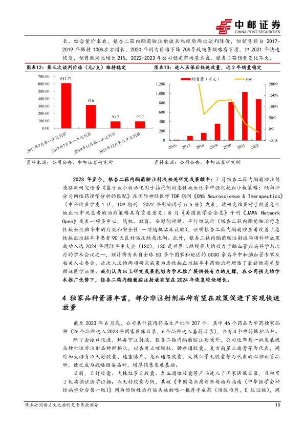 (3)银杏二萜内酯葡胺注射液: 2023 年版《国家医保目录》将其从协议期内谈判药品部分调整至中成药部分,即纳入常规目录管理,后续银杏二萜内酯葡胺注射液价格将维持稳定; 2023 年至今,银杏二萜研究成果颇丰,在国际神经医学 TOP 期刊、 JAMA 子刊发表研究成果,为学术推广提供强有力支撑, 促进其在 2024 年恢复较快增长。 此外,公司还加大打造非注射品种群梯队, 杏贝止咳颗粒、腰痹通胶囊、复方南星止痛膏等医保+基药品种有望在基药“986”政策下加速放量,天舒胶囊、大株红景天胶囊、龙血通络胶囊等医保品种有望在政策促进下实现快速放量。