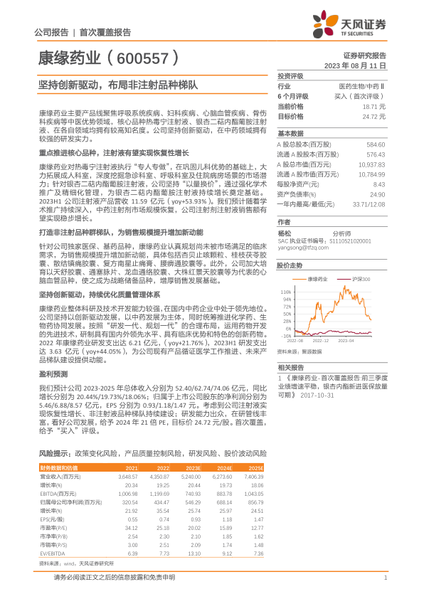 通过可比公司估值法,结合华润三九、九芝堂、方盛制药、同仁堂等同行业公司的平均估值水平,并考虑到康缘药业注射液业务的恢复性增长、非注射液品种梯队的持续建设、出众的研发能力以及丰富的在研管线,报告给予公司2024年21倍PE,目标价24.72元/股,首次覆盖给予“买入”评级。