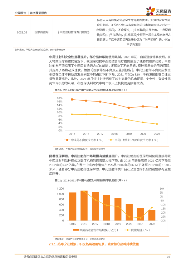 中药注射剂作为现代中药制药技术与传统中医药结合的创新剂型,具有吸收快、作用迅速的优势。尽管受“限方”、修订说明书、医保支付限定等政策影响,中药注射剂市场规模从2016年的1021亿元下降至2022年的472亿元,但在新冠疫情中展现出独特的临床优势,且不良反应发生率显著下降至2021年的3.6%,安全性显著提升。随着部分中药注射剂医保限制的解除,预计市场规模有望触底回升。