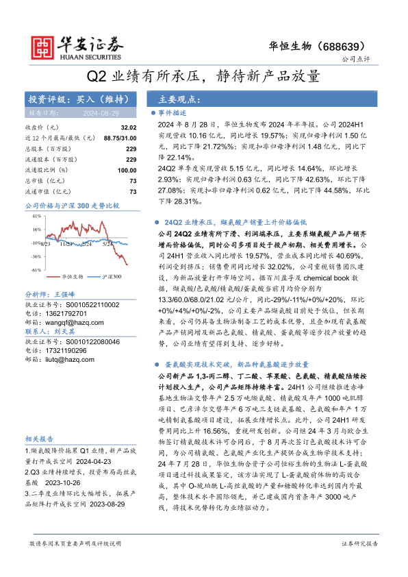 维持华恒生物“买入”评级,但下调了2024-2026年的盈利预测。尽管短期面临挑战,但长期来看,公司具备生物法制备工艺的成本优势,且新品逐步放量,业绩有望逐步好转。