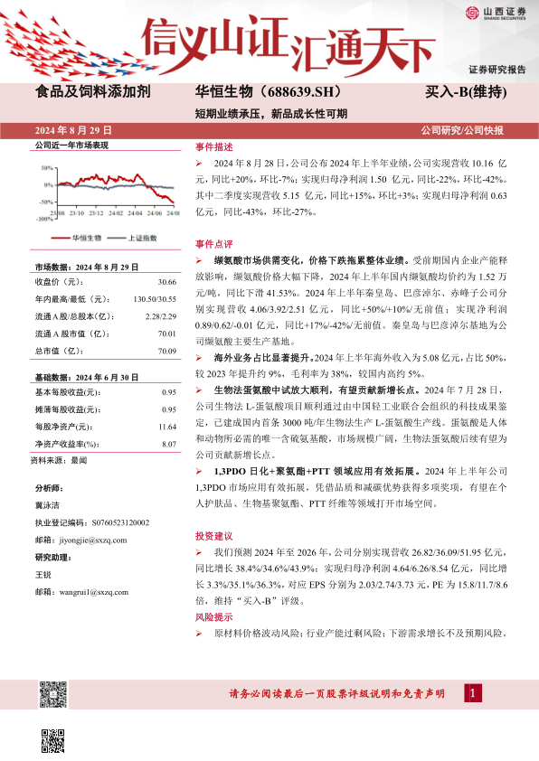 华恒生物短期业绩受到缬氨酸价格下跌的拖累,但海外业务占比提升和新产品(生物法蛋氨酸、1,3PDO)的市场拓展有望成为未来增长点。维持“买入-B”评级,但需关注原材料价格波动、行业产能过剩以及下游需求不及预期的风险。
