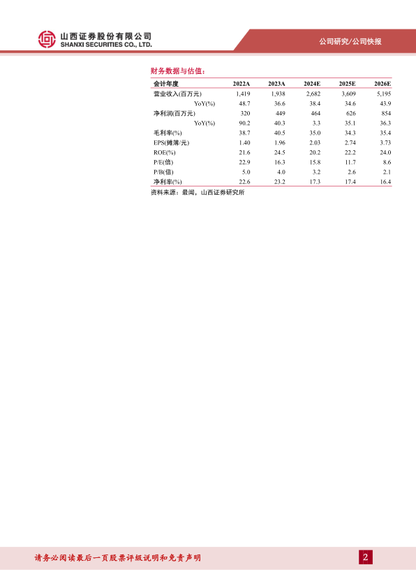 我们预测2024年至2026年,公司分别实现营收26.82/36.09/51.95亿元,同比增长38.4%/34.6%/43.9%;实现归母净利润4.64/6.26/8.54亿元,同比增长3.3%/35.1%/36.3%,对应EPS分别为2.03/2.74/3.73元,PE为15.8/11.7/8.6倍,维持“买入-B”评级。