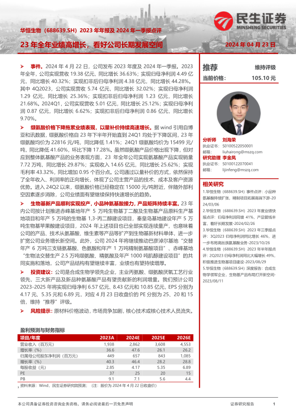 本报告对华恒生物2023年年报及2024年一季报进行了深入分析,核心观点如下: