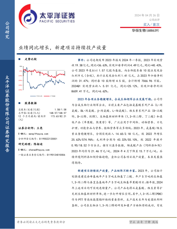 华恒生物在2023年及2024年一季度展现出强劲的财务增长势头,营业收入和归母净利润均实现显著增长。公司在氨基酸和维生素等核心业务上表现稳健,毛利率有所提升。同时,通过赤峰和秦皇岛基地的新建项目,公司成功拓展了生物基新材料单体产品线,特别是生物法1,3-丙二醇的量产,具有重要的战略意义,有望为公司带来新的增长点并提升国内产业链的自主性。尽管面临产品价格波动和项目建设等风险,但基于其产能扩张和产品多元化战略,分析师对其未来盈利能力持乐观态度,并给予“买入”评级。