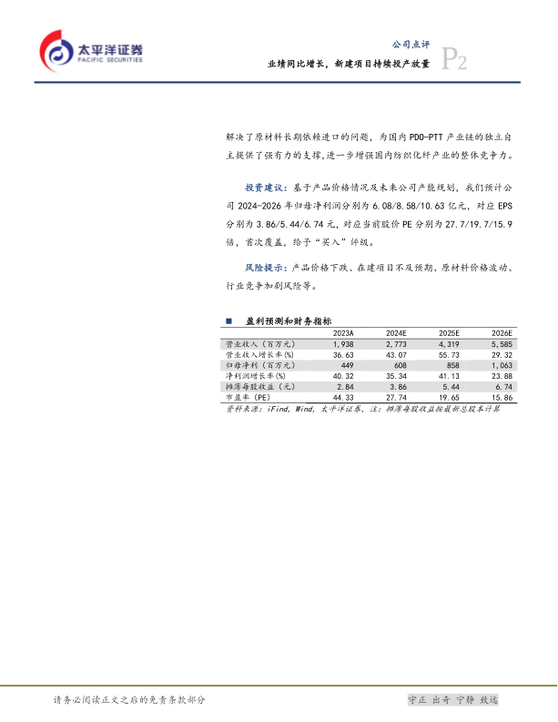 投资建议:基于产品价格情况及未来公司产能规划,我们预计公司2024-2026年归母净利润分别为6.08/8.58/10.63亿元,对应EPS分别为3.86/5.44/6.74元,对应当前股价PE分别为27.7/19.7/15.9倍,首次覆盖,给予“买入”评级。
