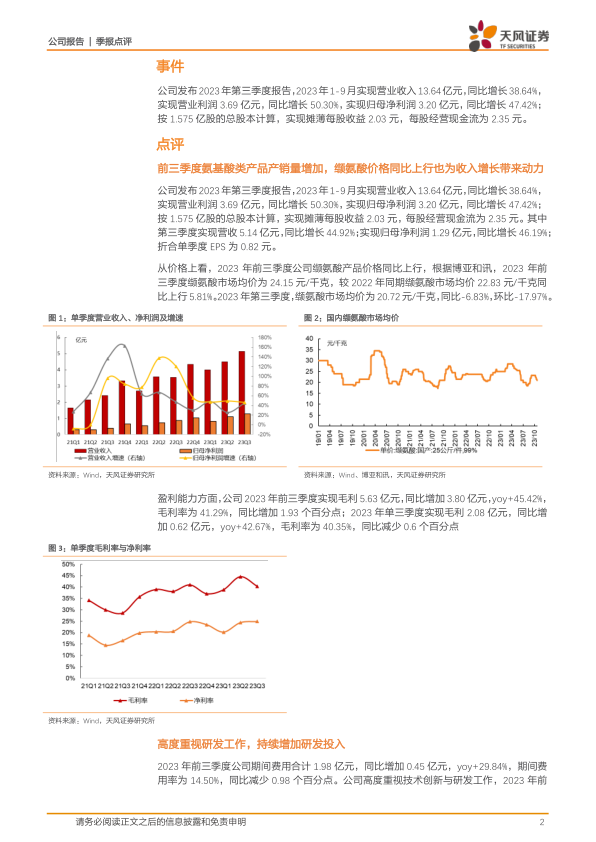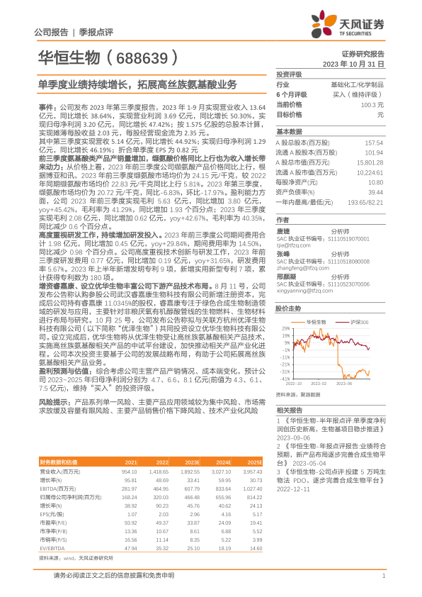 华恒生物在2023年前三季度取得了显著的业绩增长,主要受益于氨基酸类产品产销量增加和缬氨酸价格上涨。公司高度重视研发投入,积极拓展下游产品技术布局,通过增资睿嘉康、设立优华生物等方式,丰富产品线。同时,多个生物基项目稳步推进,为公司未来发展奠定基础。维持“买入”的投资评级,但需关注产品单一、应用集中、市场需求放缓等风险。