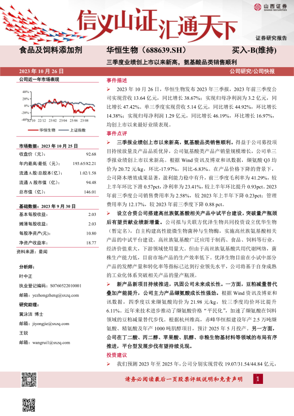 华恒生物在2023年第三季度实现了上市以来的最佳业绩表现,营收和归母净利润均创历史新高,分别同比增长44.92%和46.19%。这一强劲增长主要得益于公司募投项目的持续放量、氨基酸品类销售的顺利推进以及显著的降本增效成果。