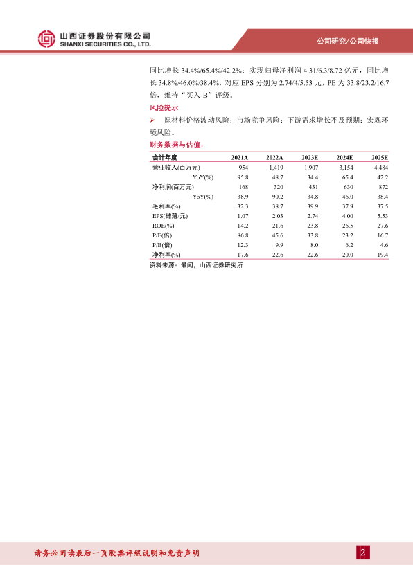 我们预测2023年至2025年,公司分别实现营收19.07/31.54/44.84亿元,同比增长34.4%/65.4%/42.2%;实现归母净利润4.31/6.3/8.72亿元,同比增长34.8%/46.0%/38.4%,对应EPS分别为2.74/4/5.53元,PE为33.8/23.2/16.7倍,维持“买入-B”评级。