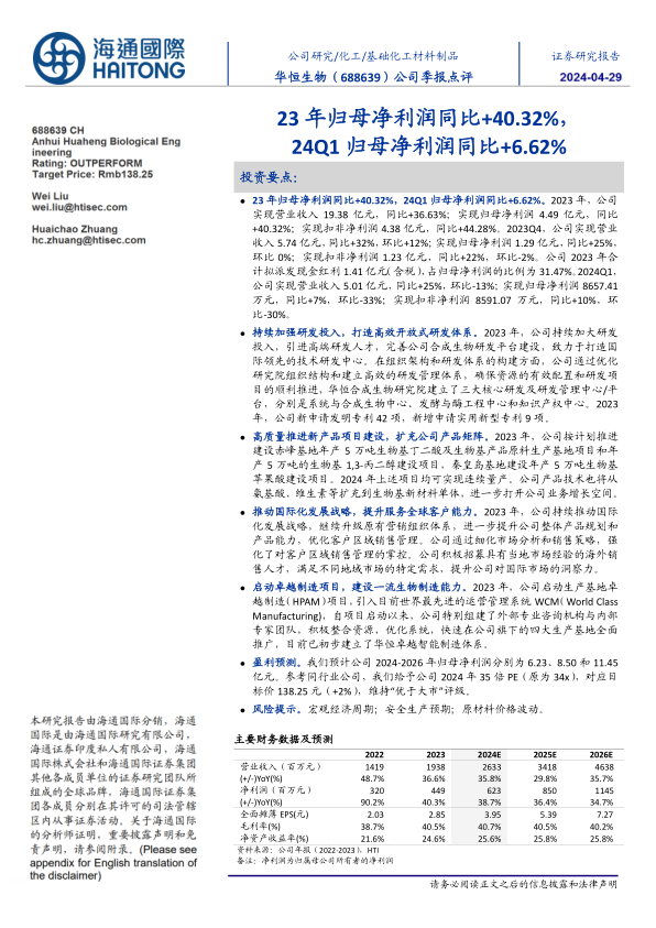 华恒生物在2023年取得了显著的业绩增长,并在2024年一季度保持了增长势头。公司通过持续的研发投入、新产品项目建设、国际化战略和卓越制造项目,不断提升自身的核心竞争力。预计未来几年,公司将继续保持良好的发展态势,实现盈利能力的持续增长。维持“优于大市”评级。