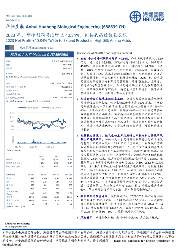 本报告分析了华恒生物2023年的业绩表现,指出其归母净利润同比增长40.84%,并详细阐述了公司在高丝族氨基酸业务拓展和生物基产品生产基地建设方面的投资计划。海通国际维持对华恒生物“优于大市”的评级,并给出了未来三年的盈利预测。同时,报告也提示了投资者需要关注的市场竞争、原材料价格和技术迭代等风险因素。