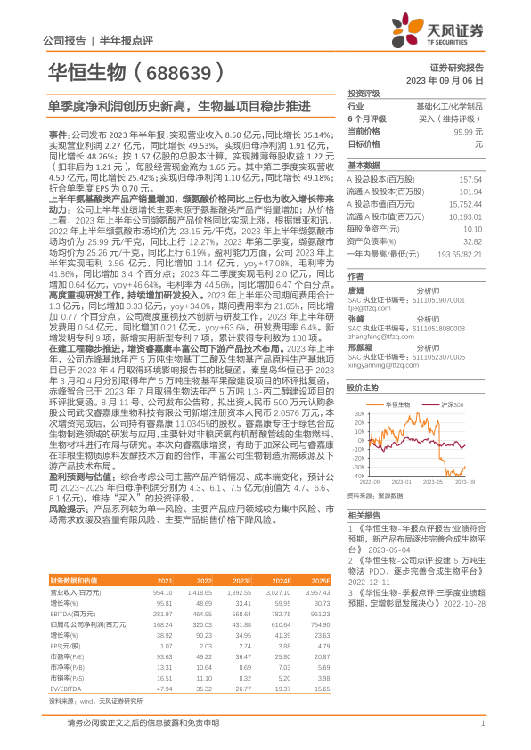 综合考虑公司主营产品产销情况及成本端变化,天风证券研究所对华恒生物2023年至2025年的归母净利润预测进行了调整,分别为4.3亿元、6.1亿元和7.5亿元,并维持“买入”的投资评级。报告同时提示了潜在风险,包括产品系列较为单一、主要产品应用领域较为集中、市场需求放缓及容量有限,以及主要产品销售价格下降等风险,提醒投资者关注。