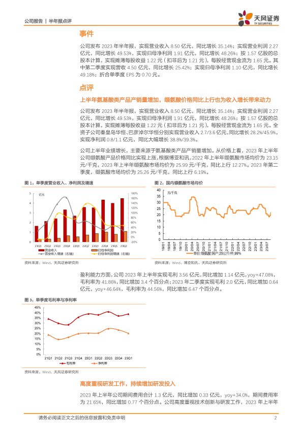 上半年氨基酸类产品产销量增加,缬氨酸价格同比上行也为收入增长带来动力:公司上半年业绩增长主要来源于氨基酸类产品产销量增加;从价格上看,2023年上半年公司缬氨酸产品价格同比实现上涨,根据博亚和讯,2022年上半年缬氨酸市场均价为23.15元/千克,2023年上半年缬氨酸市场均价为25.99元/千克,同比上行12.27%。2023年第二季度,缬氨酸市场均价为25.26元/千克,同比上行6.19%。盈利能力方面,公司2023年上半年实现毛利3.56亿元,同比增加1.14亿元,yoy+47.08%,毛利率为41.86%,同比增加3.4个百分点;2023年二季度实现毛利2.0亿元,同比增加0.64亿元,yoy+46.64%,毛利率为44.56%,同比增加6.47个百分点。