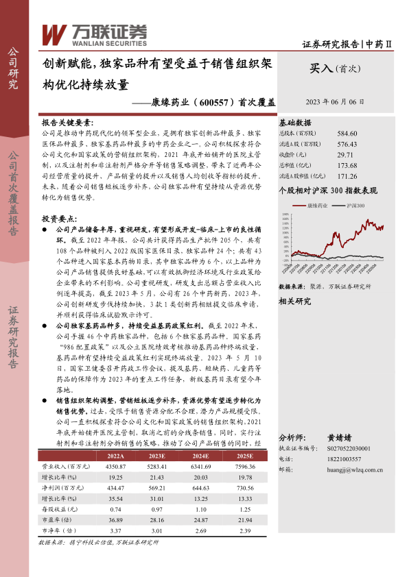 康缘药业作为中药创新领域的龙头企业,拥有丰富的独家基药和独家医保品种,并持续投入高比例研发以保持产品线的创新活力。公司自2021年底以来实施的销售组织架构改革,有效解决了营销短板问题,显著提升了经营效率和销售能力,使得公司整体业绩稳步增长,财务指标持续改善。随着销售能力的逐步补齐,热毒宁注射液、银杏二萜内酯葡胺注射液和金振口服液等核心产品以及杏贝止咳颗粒、散寒化湿颗粒、参乌益肾片等二线潜力品种有望将资源优势转化为销售优势,实现持续放量。结合国家对中医药发展的政策利好,公司未来有望保持持续增长,首次覆盖给予“买入”评级。投资者需关注政策变化、产品质量控制、研发不达预期及药品市场准入等风险。