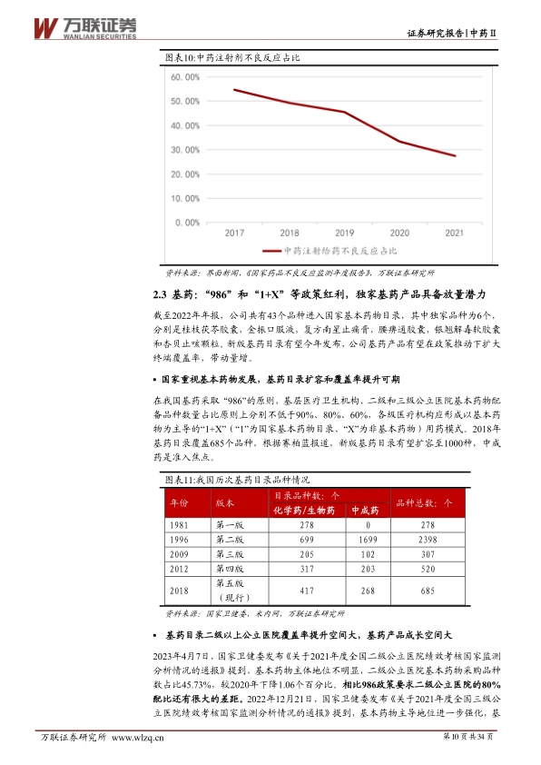 政策层面,中药创新药受益于国家自2019年以来颁布的一系列鼓励政策,如《关于促进中医药传承创新发展的意见》和《中药注册管理专门规定》,推动中医药高质量发展。2021年有12个中药创新药获批上市,2022年有7个,2023年截至4月18日,上市和临床申请数量已超过2022年全年的一半,显示中药创新热情持续。中药注射剂虽受“限方”、医保支付限定等政策影响,2015-2019年重点城市公立医院终端销售收入从110.83亿元降至98.15亿元,但经过市场淘汰,安全性高、临床数据完善的高质量中药注射剂仍具备发展空间,不良反应占比持续下降。基本药物政策方面,“986配置政策”和公立医院绩效考核推动基药品种终端放量。2018年基药目录覆盖685个品种,新版目录有望扩容至1000种。然而,2021年度全国二级和三级公立医院基本药物采购品种数占比分别为45.73%和42.59%,与政策要求的80%和60%仍有较大差距,预示着基药产品未来在公立医院的覆盖率和采购比例有巨大提升空间。