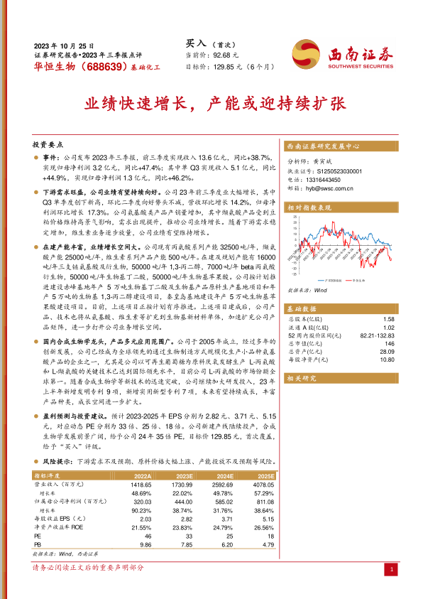 华恒生物作为国内合成生物学领域的领军企业,在2023年前三季度展现出强劲的业绩增长势头,这主要得益于其核心氨基酸产品的市场需求旺盛以及公司持续的研发投入。公司通过丰富的在建及规划产能,积极拓展生物基新材料领域,有望进一步巩固其市场地位并打开新的增长空间。在国家政策的大力支持下,结合其环保高效的生物制造技术优势,华恒生物的长期发展前景广阔。尽管存在下游需求不及预期、原材料价格波动和产能投放风险,但基于其领先的技术、稳健的业绩增长和明确的扩张战略,公司具备显著的投资价值。