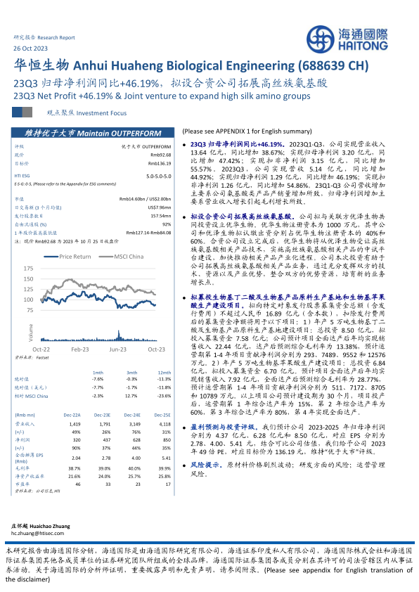 本报告分析了华恒生物2023年第三季度的业绩表现,以及公司在高丝氨基酸业务拓展和生物基产品生产方面的战略布局。公司通过设立合资公司和募投项目,有望实现业务多元化和业绩增长。维持“优于大市”评级,但同时也提示了原材料价格波动、研发和运营管理等方面的风险。