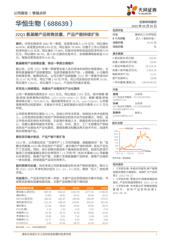 本报告对华恒生物2022年一季报进行了深入分析,指出公司业绩增长主要受益于氨基酸类产品销量增加,毛利率提升反映了产品经济性的增强。公司在研发投入和产能扩张方面均有显著进展,为未来发展奠定了基础。维持“买入”评级,但同时也提示了相关风险。