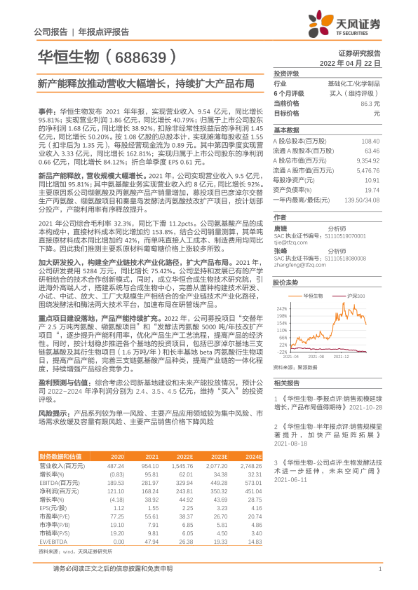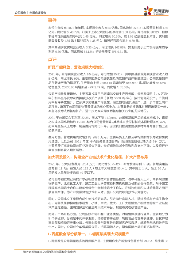 事件:华恒生物发布2021年年报,实现营业收入9.54亿元,同比增长95.81%;实现营业利润1.86亿元,同比增长40.79%;归属于上市公司股东的净利润1.68亿元,同比增长38.92%,扣除非经常性损益后的净利润1.45亿元,同比增长50.20%。按1.08亿股的总股本计,实现摊薄每股收益1.55元(扣非后为1.35元),每股经营现金流为0.89元。其中第四季度实现营业收入3.33亿元,同比增长162.81%;实现归属于上市公司股东的净利润0.66亿元,同比增长84.12%;折合单季度EPS0.61元。