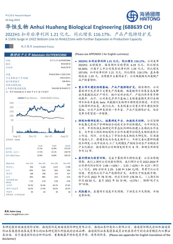 华恒生物在2022年上半年展现出强劲的业绩增长势头,扣非后净利润同比翻番,主要得益于核心产品产销量的显著提升。公司通过募投项目和在建项目的稳步推进,持续扩充产能,并积极布局三支链氨基酸及其衍生物等新产品,为未来业绩增长奠定坚实基础。同时,公司持续加大研发投入,深化产学研合作,构建全产业链技术创新体系,不断提升核心竞争力。分析师基于公司产能扩张和超预期业绩,大幅上调了盈利预测和目标价,并维持“优于大市”评级,反映了对公司未来发展的积极展望。然而,投资者仍需关注在建项目进度、下游需求变化以及市场竞争加剧等潜在风险。