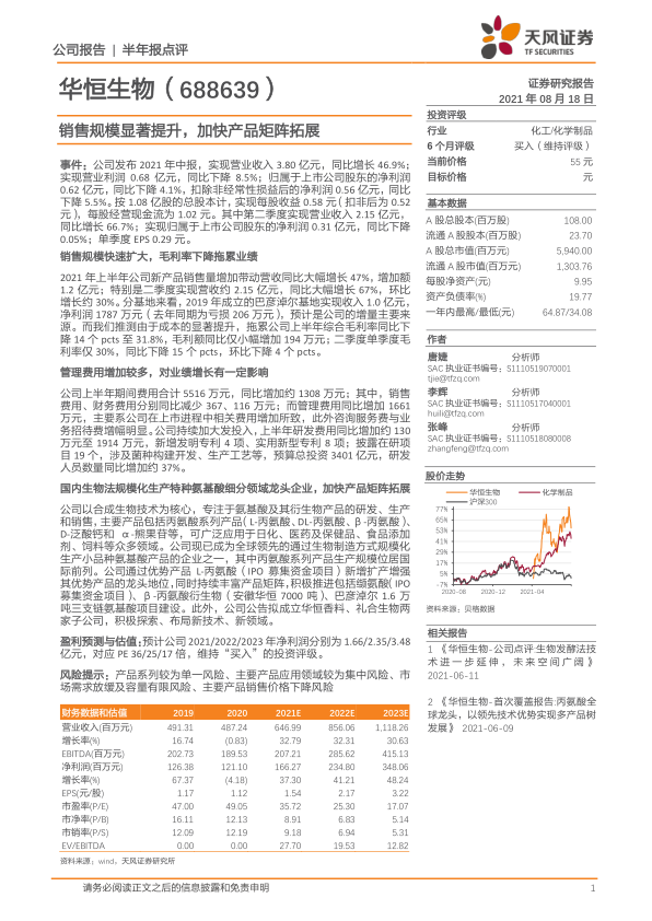 华恒生物2021年中报显示公司营收大幅增长,但盈利能力受到毛利率下降的影响。公司作为行业龙头,正积极拓展产品矩阵和加大研发投入,未来发展潜力可期。天风证券维持对公司“买入”的投资评级,并预测未来三年净利润将持续增长。