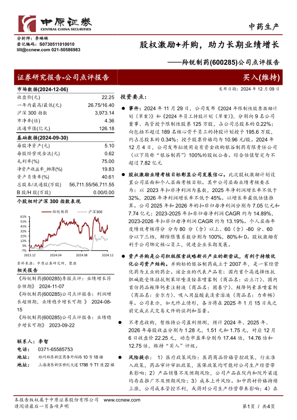 事件:2024年11月29日,公司发布《2024年限制性股票激励计划(草案)》和《2024年员工持股计划(草案)》,分别向9名公司董事、高管授予限制性股票125万股,占公司总股本的0.22%;向包括不超过189名核心骨干员工的持股计划授予195.6万股,约占总股本的0.34%;授予股票价格均为10.96元/股。2024年12月4日,公司发布拟使用自有资金收购银谷制药有限责任公司(以下简称“银谷制药”)100%的股权公告。综合估值暂定为不超过7.82亿元