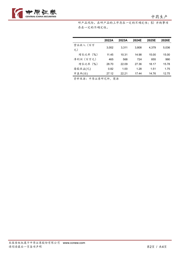风险提示:1)医疗政策风险:医药商品价格管控政策,行业准入政策,药品审评审批政策,医保政策均可能对公司生产经营带来影响;2)产品销售不及预期风险,公司产品在院内和院外渠道均存在推广不及预期风险;3)成本上升风险。如中药材价格持续上涨,公司成本管控不利,或将对公司生产经营带来影响;4)在研产品风险。在研产品的上市存在一定的不确定性;5)并购事项存在一定的不确定性。