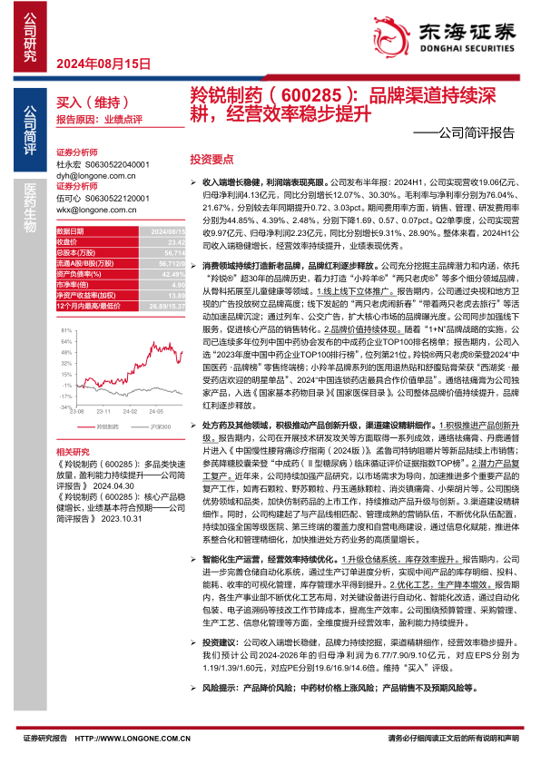 风险提示:产品降价风险;中药材价格上涨风险;产品销售不及预期风险等。