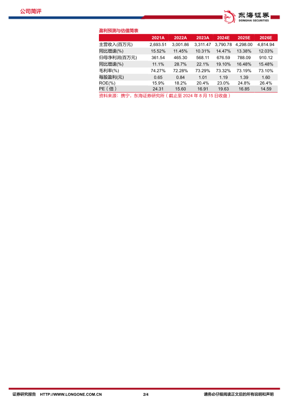投资建议:公司收入端增长稳健,品牌力持续挖掘,渠道精耕细作,经营效率稳步提升。我们预计公司2024-2026年的归母净利润为6.77/7.90/9.10亿元,对应EPS分别为1.19/1.39/1.60元,对应PE分别19.6/16.9/14.6倍。维持“买入”评级。