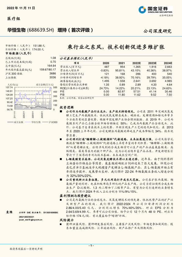 华恒生物作为合成生物学领域的领先企业,凭借其在丙氨酸市场的全球龙头地位和厌氧发酵技术的持续创新,实现了核心业务的稳健增长。公司通过打通“糖酵解-三羧酸循环”代谢通路,为L-缬氨酸、D-泛酸钙、1,3丙二醇和丁二酸等多元化产品布局奠定了坚实基础,并受益于合成生物学产业化趋势和“碳中和”政策。尽管面临菌种泄露、研发竞争、主要客户流失和新产品推广不及预期等风险,但公司凭借其技术优势、市场拓展能力和优化后的客户结构,预计2022-2024年归母净利润将分别同比增长70%/40%/40%,具备较高的投资价值,首次覆盖给予“增持”评级,目标价格174元/股。