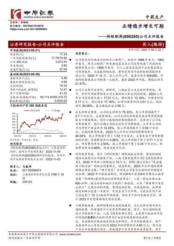 公司前身为河南省信阳羚羊山制药厂,始创于1988年8月;1992年6月,羚羊山制药厂和香港锐星企业公司合资组建了河南羚锐制药有限公司;1999年6月,引入上海复星医药产业发展有限公司等新股东,完成股份制改造,整体变更为河南羚锐制药股份有限公司;2000年10月,在上交所上市,股票代码为600285。河南羚锐集团是公司的第一大股东,截至2023年中报,持股比例为21.47%。